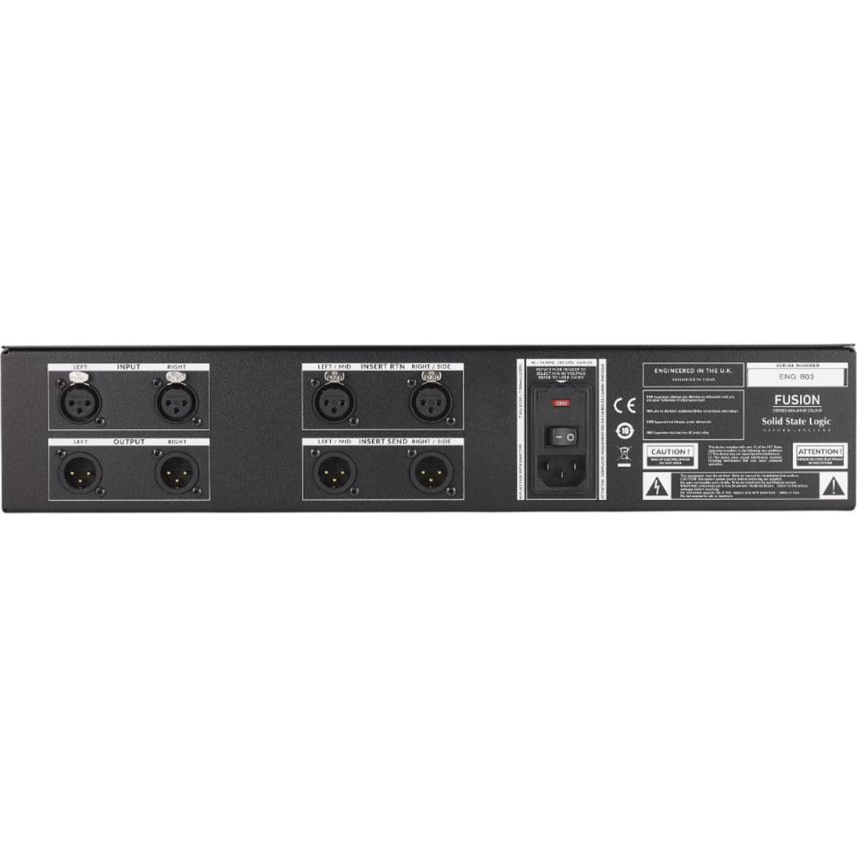 SSL has also always been known for clever connectivity and features that streamline and accelerate production workflow. Fusion fits right in with a collection of workflow enhancing features including: +/-12dB Input and Output Trim controls, an Input overload LED, large peak-hold metering, a front-end 3rd order High Pass Filter with three selectable cut off frequencies, and tri-colour status indicators for the Vintage Drive and HF Comp/LMC sections. A set of XLR connections can be used either as a Stereo Insert for stereo mix bus processing or switched to function as a Mid-Side (MS) circuit enabling separate compressors or EQ to be applied to the middle (centre) and sides of a stereo signal. In Stereo Insert mode the insert point can be switched to pre-Violet EQ, when in MS mode the insert can be switched to pre-Stereo Image controls. Input and Output connections are via XLR.