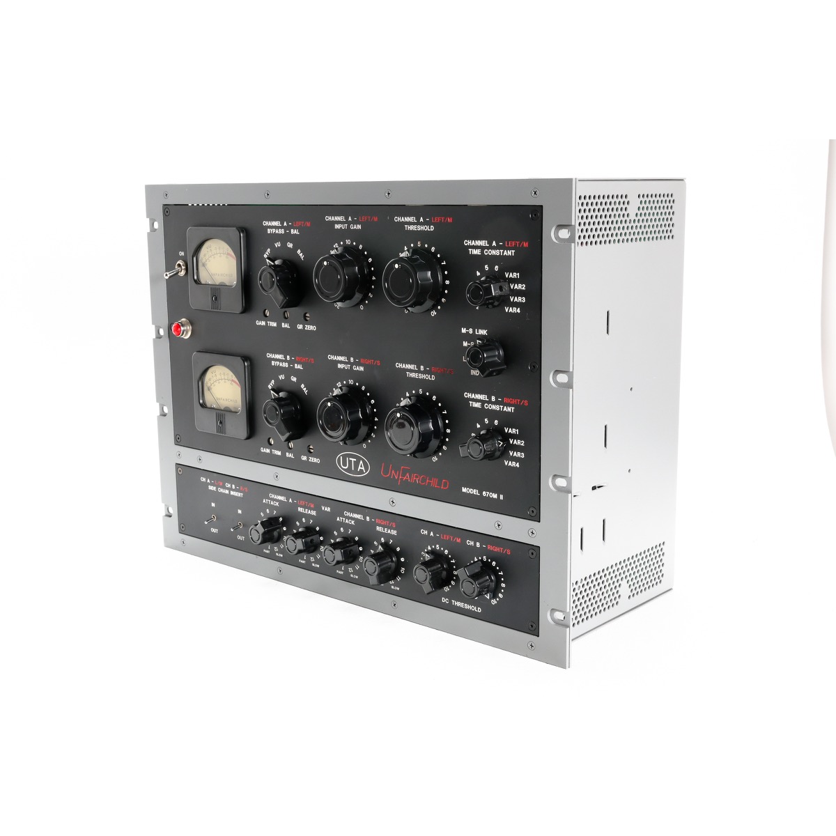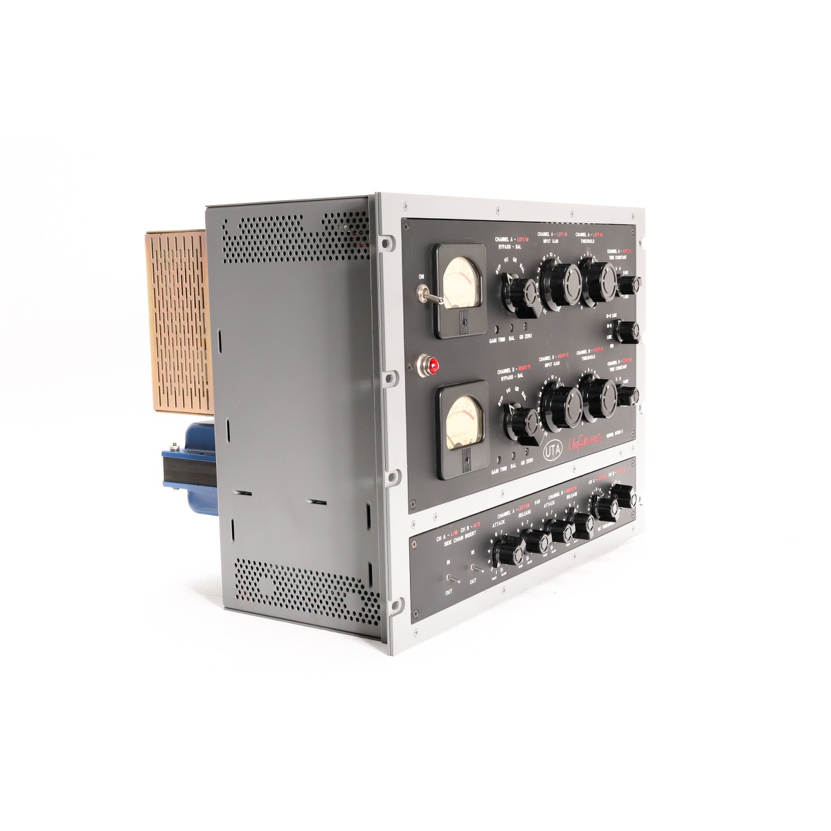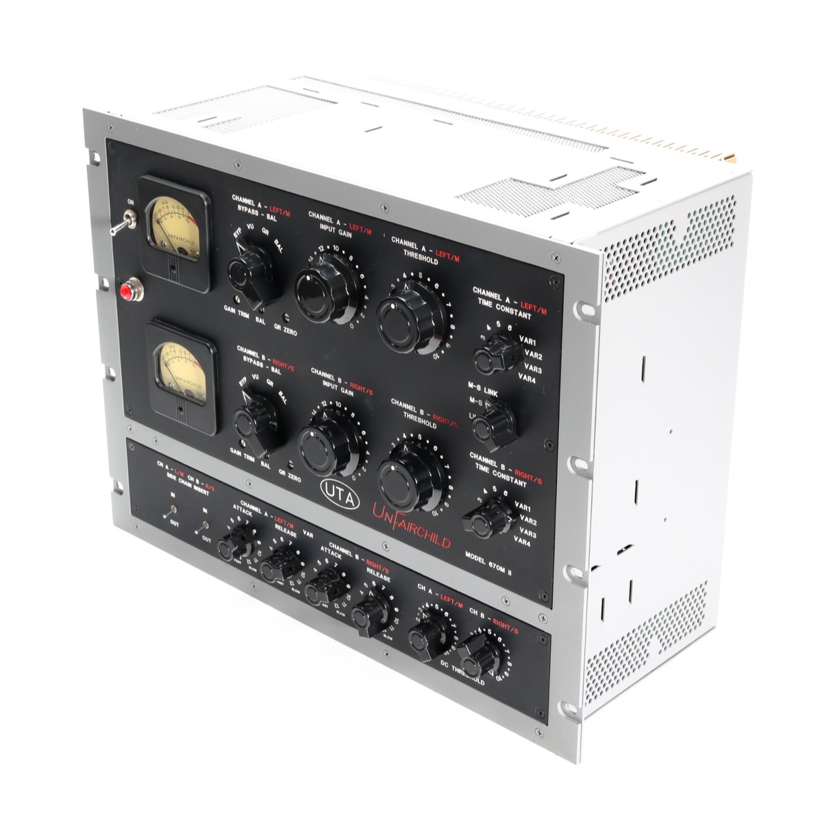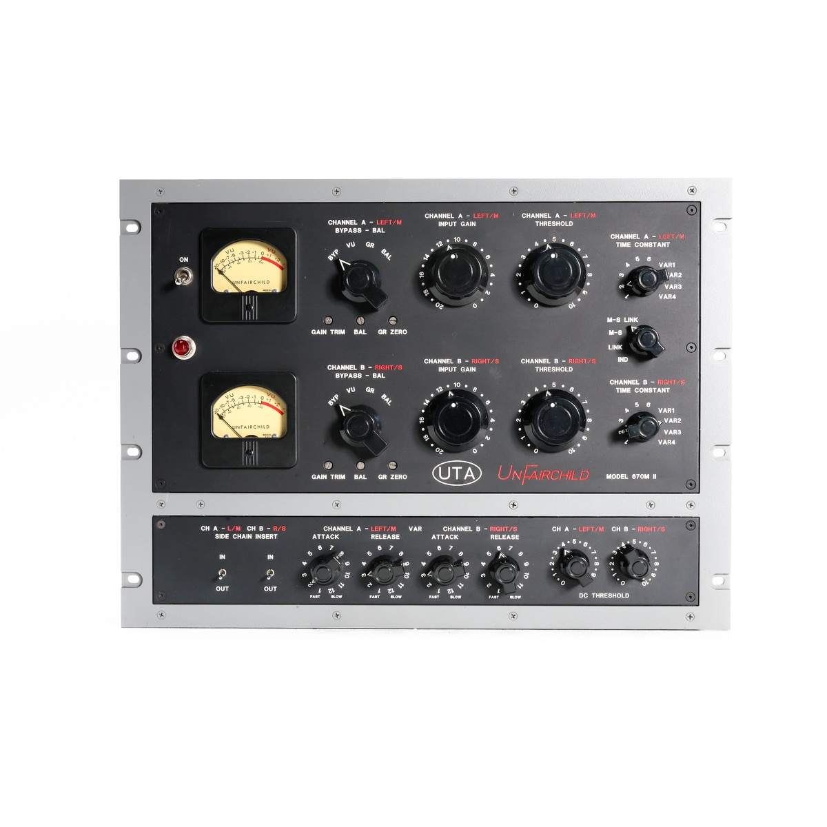 The Fairchild circuit could be one of the most coveted and time tested compressors of all time. It has proven its extraordinary universal musicality for over 5 decades on countless genres of music. The beauty of its design is in its simplicity. The audio path, primarily consisting of only 2 transformers and 4 paralleled vari-mu tubes, can provide a gentle smoothing of levels or an explosive, energizing compression that will make any recording leap out of the speakers. The UTA UnFairchild is a painstaking recreation of the classic sound of this circuit.
